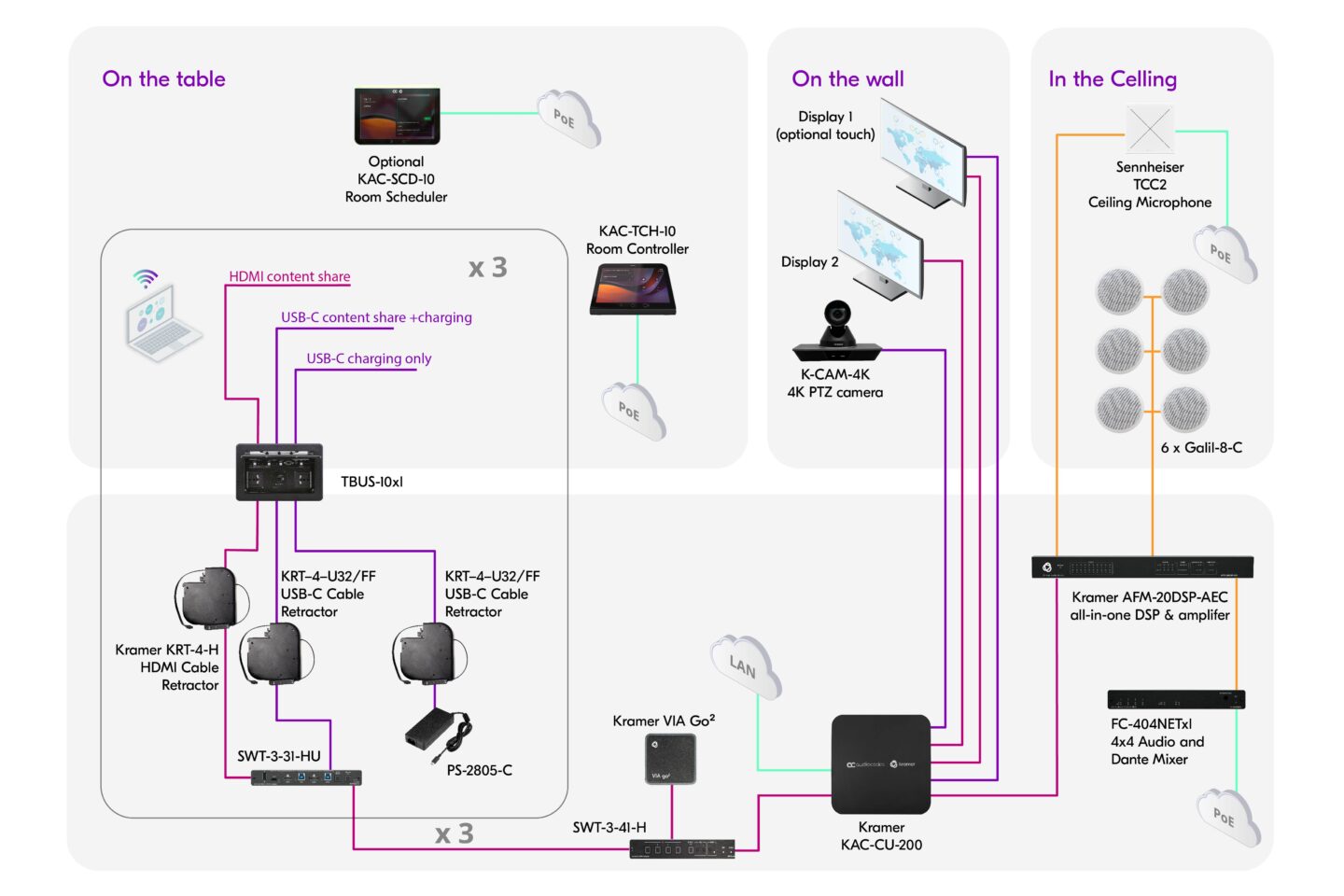 Content sharing is made accessible from any seat, supported by multiple TBUS (table connectivity solution) locations and a variety of content sharing methods. The setup includes two or more cameras for meeting or presentation modes, further augmented by the optional addition of the KAC-CAM-CC-10 content camera. Integrated room control extends to lights, shades, cameras, and AV, while also providing charging facilities for hosts’ and participants’ laptops, accommodating the needs of long meetings.